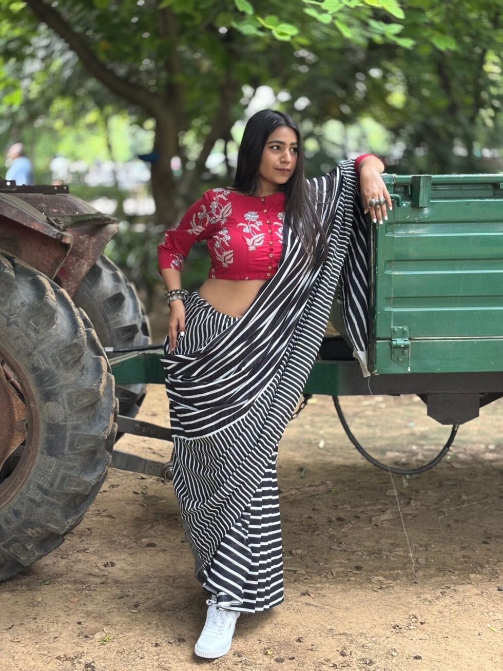 This elegant sari effortlessly blends tradition with modern flair. The classic black-and-white stripes add a bold, contemporary twist, while the soft drape flows with grace and confidence. Paired with a striking red blouse adorned with intricate white floral handblock print, the look is both rooted in heritage and styled for the modern woman. Perfect for a day in nature or a cultural celebration, this ensemble speaks volumes with simplicity and strength.