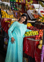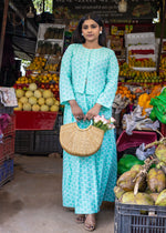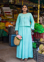 Elevate your everyday style with the effortless charm of our Dilruba Set. Crafted in soft, breathable cotton, this set features a relaxed-fit button-down top and matching A-line long skirt, both adorned with soothing aqua tones and delicate white hand-block printed motifs.