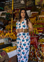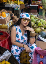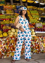 A breezy co-ord set featuring a sleeveless V-neck waist coat with wooden buttons and relaxed wide-leg pants, all hand block-printed with bold blue leaves and blush pink blooms on crisp white cotton.