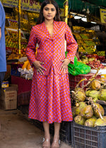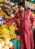 Color: A vibrant red base uplifted with multicolor hand block checks