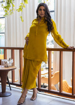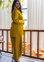 Where classic shirt meets luxe drape — in a molten Golden yellow satin that catches every light