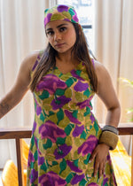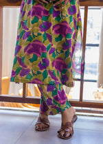 Sleeveless asymmetrical kurta paired with matching tapered pants, showcasing a lively blend of purples, greens, and yellow in a floral pattern. The relaxed fit drapes gracefully, flattering every silhouette.